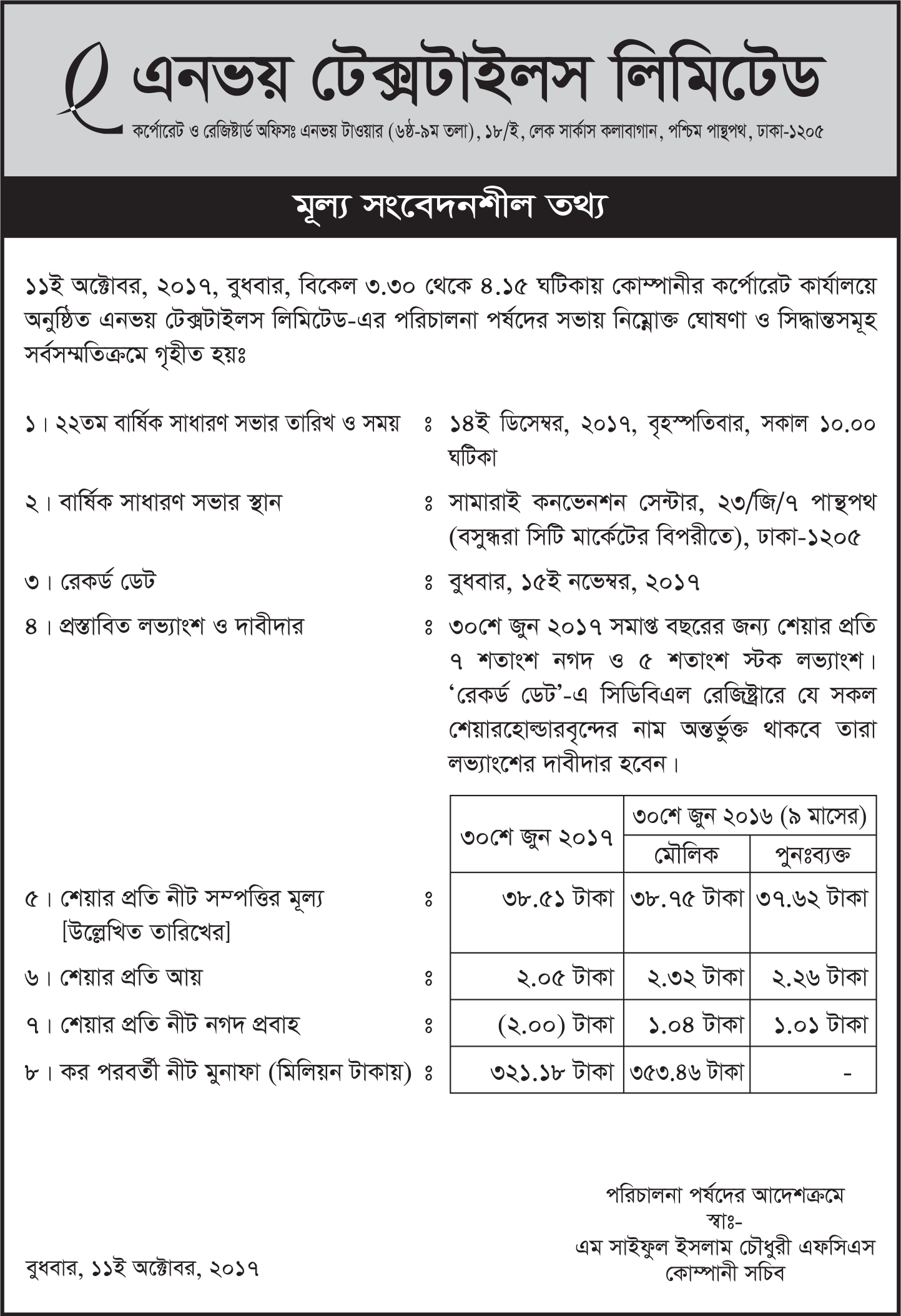 Half Yearly Un-audited Financial Statements of Envoy Textiles Limited