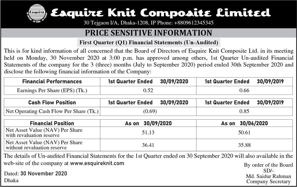 Price Sensitive Information of Esquire Knit Composite Ltd.