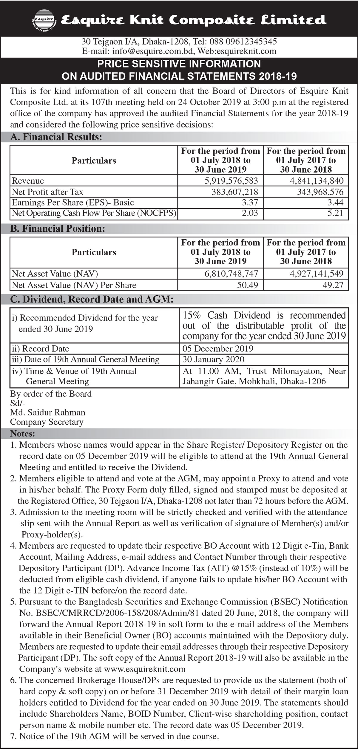 Price Sensitive Information of Esquire Knit Composite PLC.