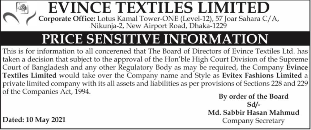 Price Sensitive Information of Evince Textiles Ltd