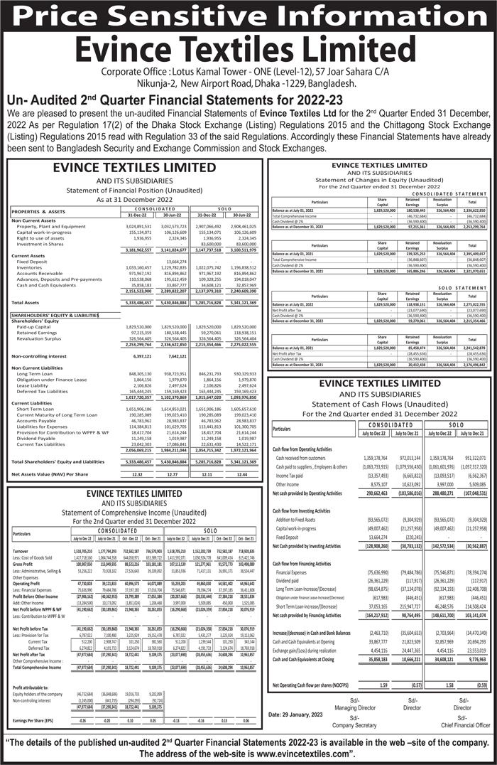 Price Sensitive Information of Evince Textiles Ltd