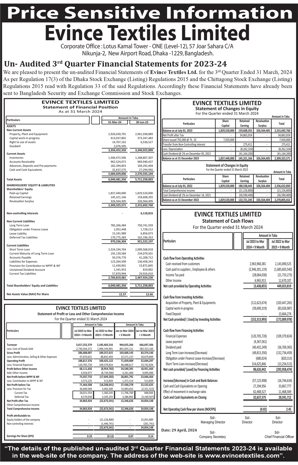 Price Sensitive Information of Evince Textiles Limited
