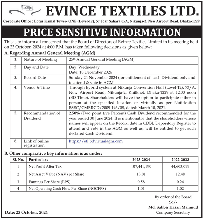 Price Sensitive Information of Evince Textiles Limited