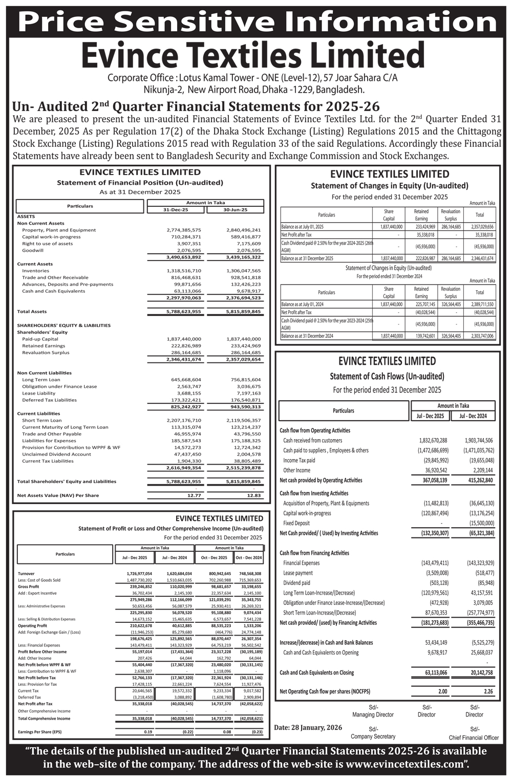 Price Sensitive Information of Evince Textiles Ltd