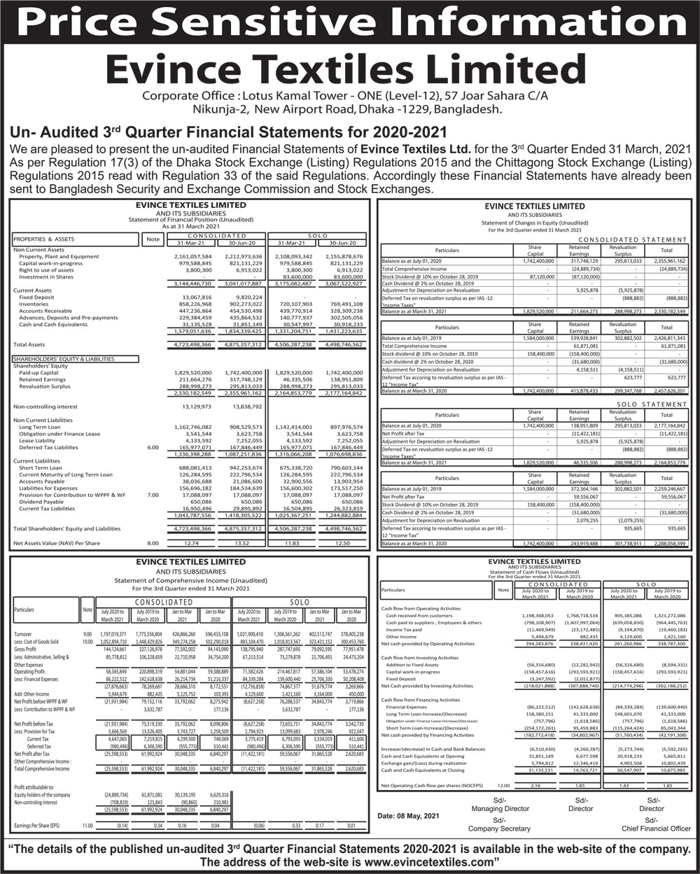 Price Sensitive Information of Evince Textiles Ltd