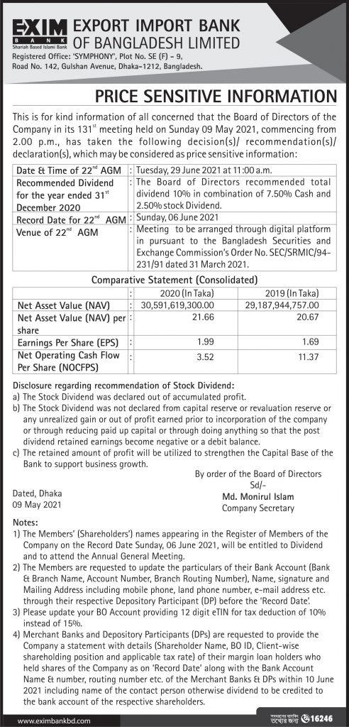 Price Sensitive Information Of EXIM BANK