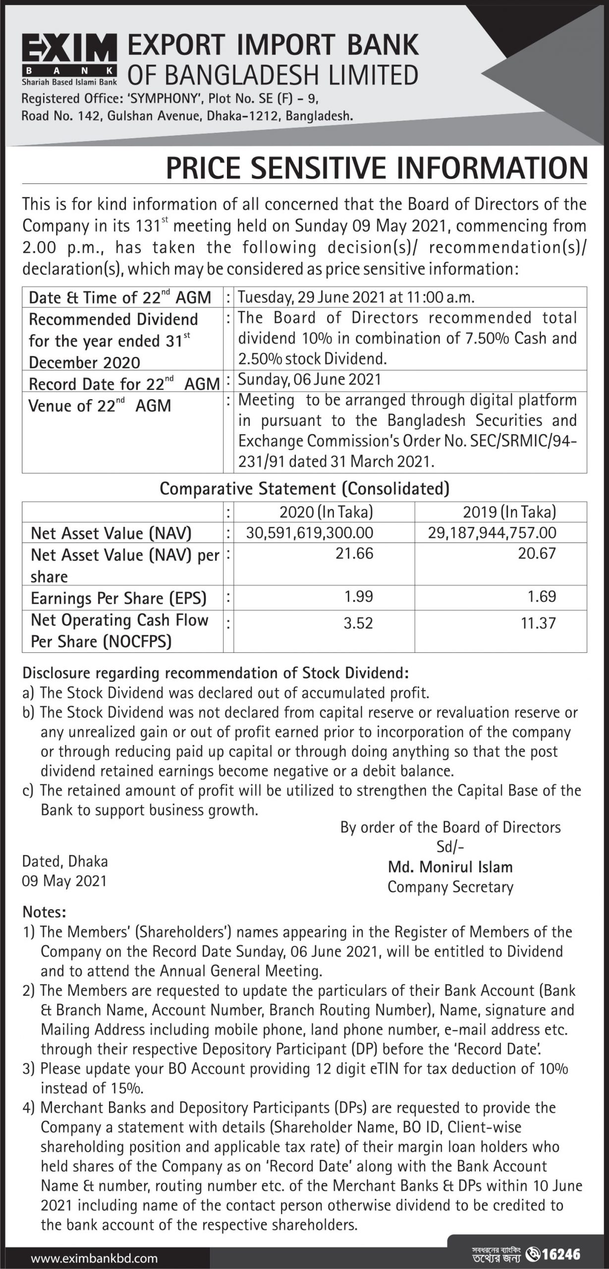 Notice of the 25th AGM of EXIM Bank