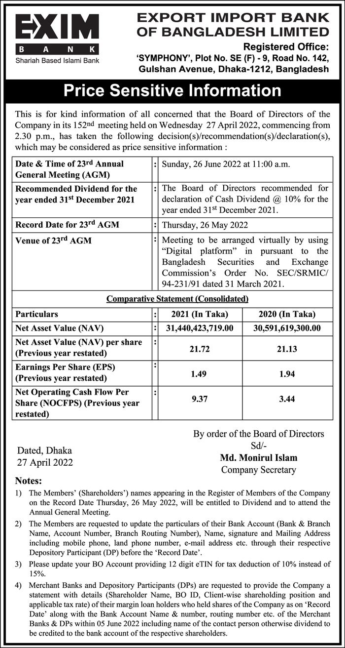 Half Yearly Un-audited Financial Statements of EXIM Bank