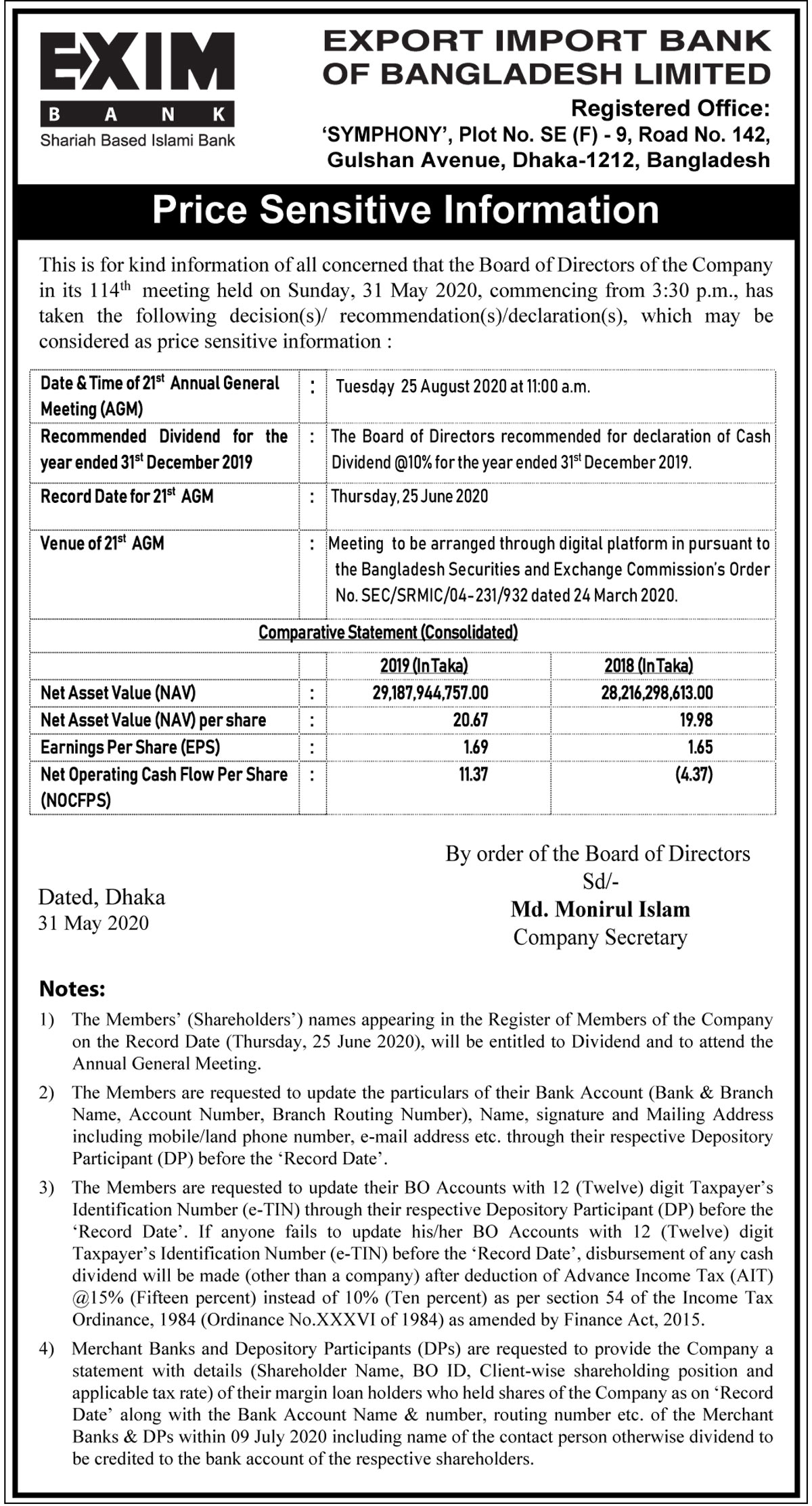 Notice of the 25th AGM of EXIM Bank
