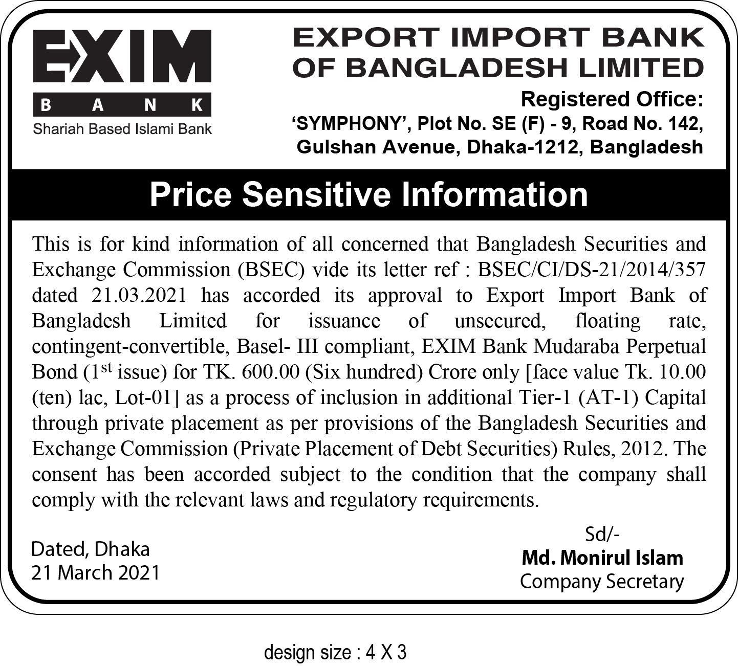 Price Sensitive Information of EXIM Bank Ltd.