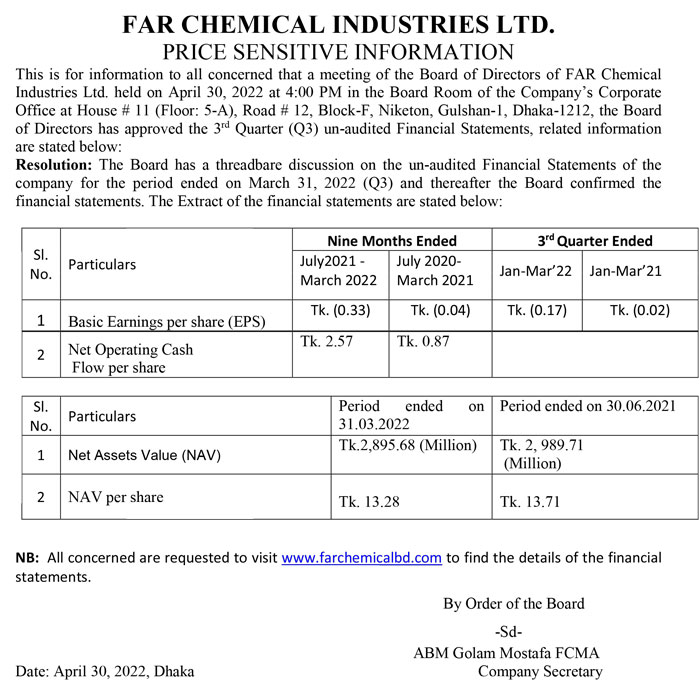 Price Sensitive Information of Far FAR Chemical & Textile Ind. PLC