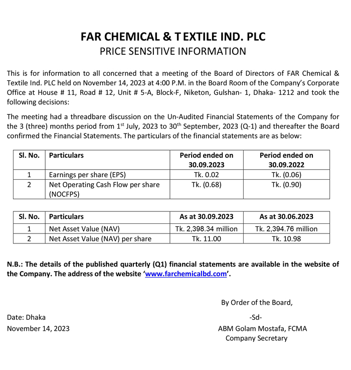 Price Sensitive Information of FAR Chemical & Textile Ind. PLC