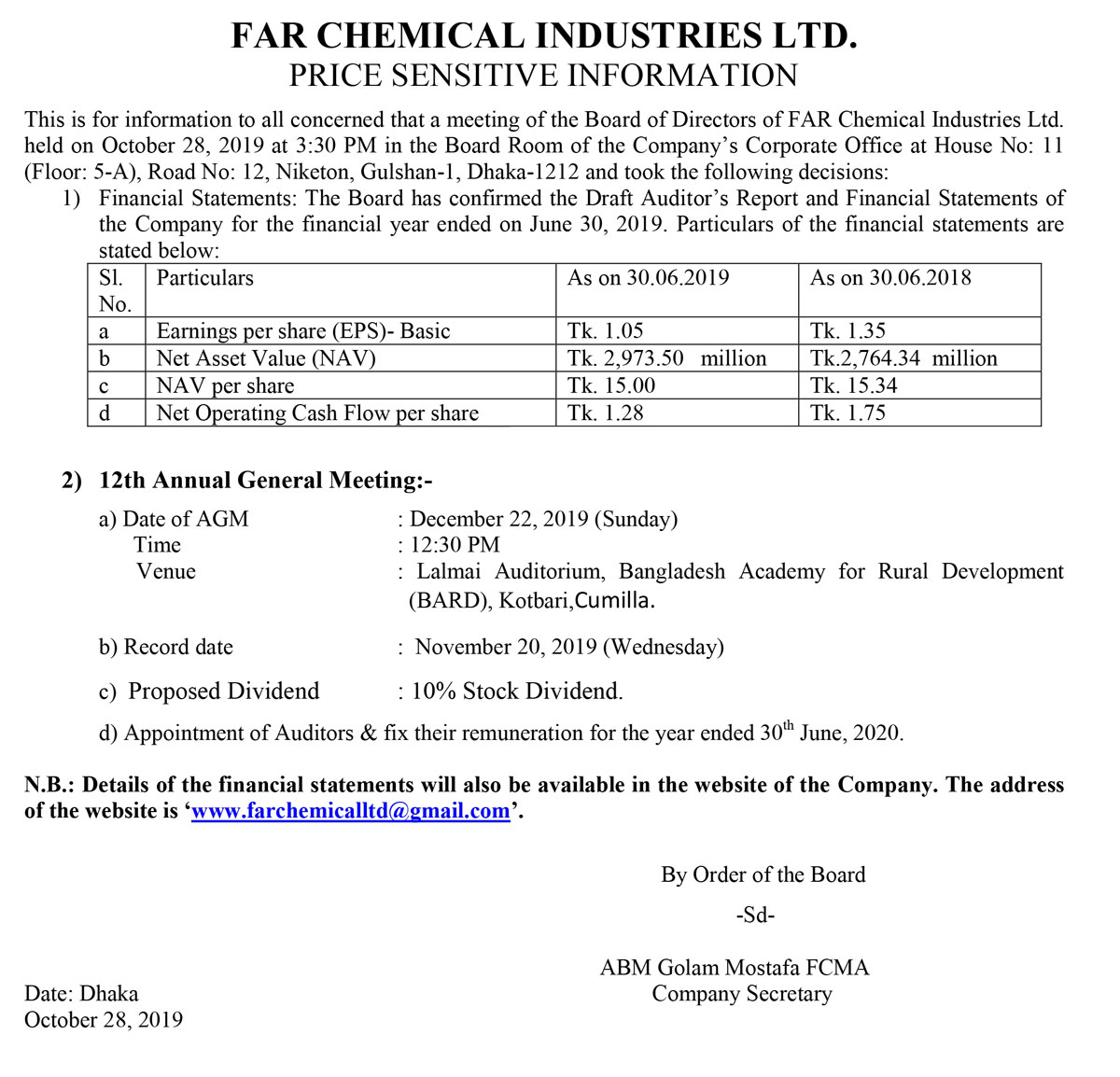 Price Sensitive Information of FAR Chemical & Textile Ind. PLC