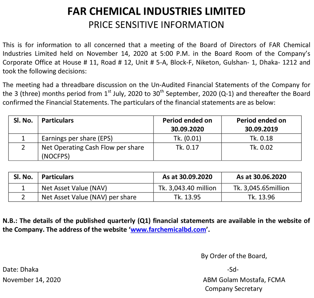 Price Sensitive Information of FAR Chemical & Textile Ind. PLC