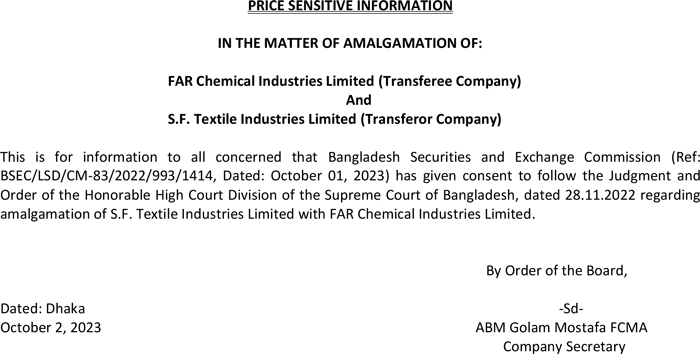 Price Sensitive Information of FAR Chemical Industries Ltd. & S.F. Textile Industries Ltd.