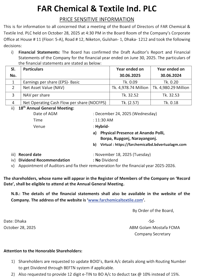 Price Sensitive Information of Far Chemical & Textile Ind. PLC.