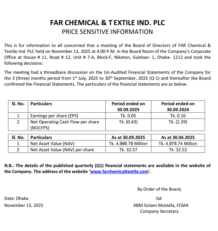 Price Sensitive Information of FAR Chemical & Textile Ind. PLC