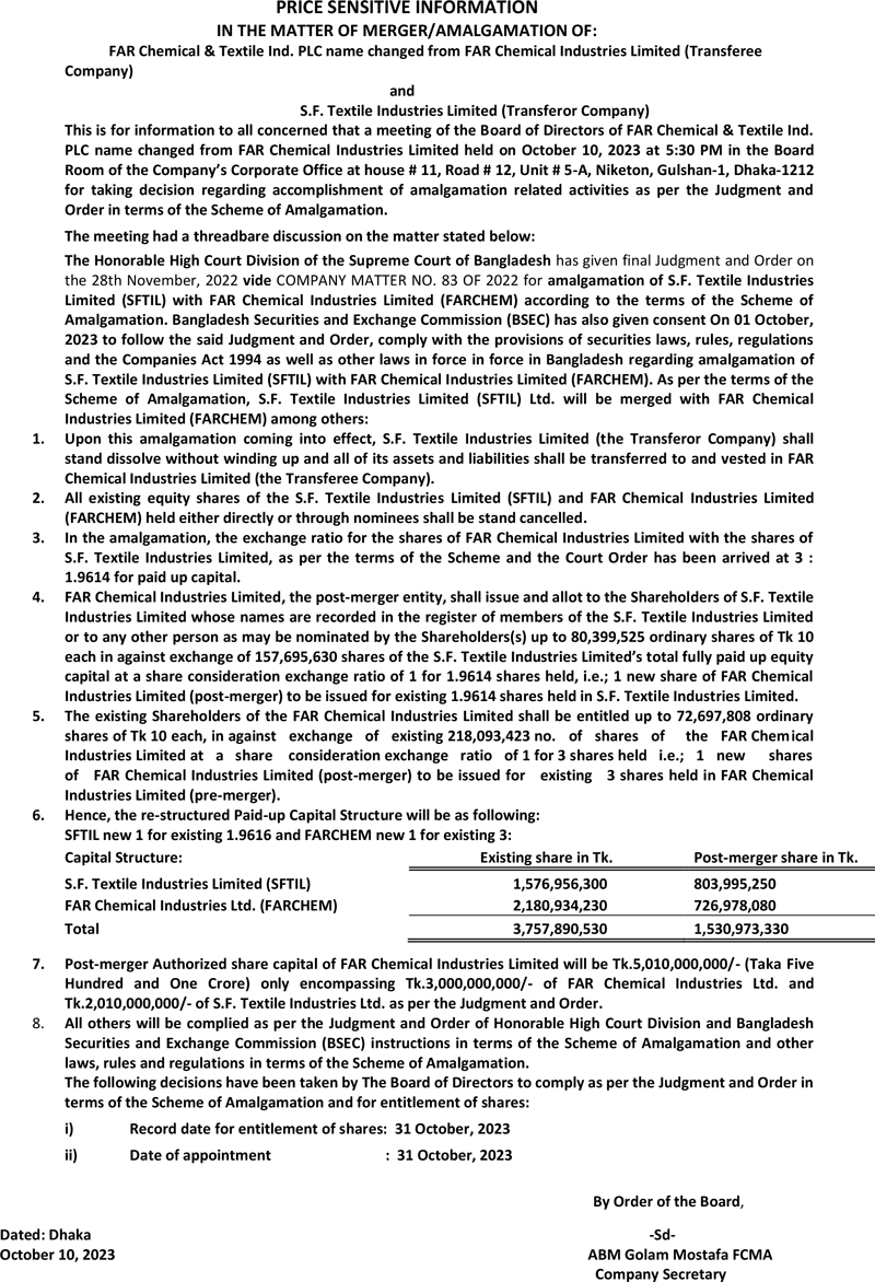 Price Sensitive Information of Far Chemical & Textile Ind. PLC.