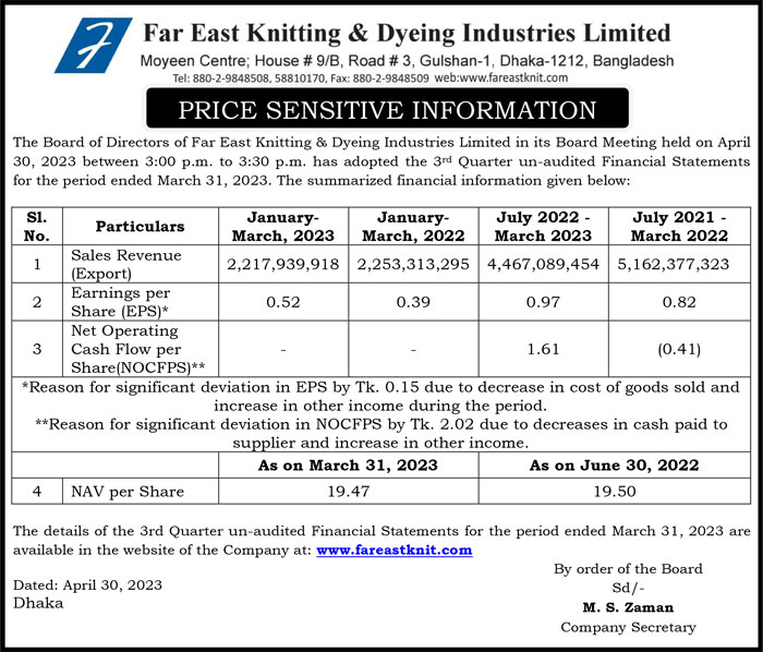 Price Sensitive Information of Far East Knitting & Dyeing Industries Limited