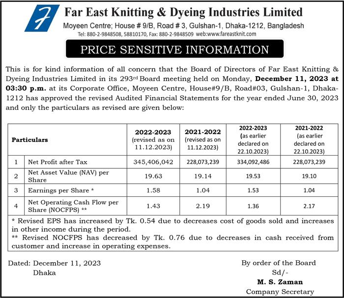 Price Sensitive Information of Far East Knitting & Dyeing Industries Limited