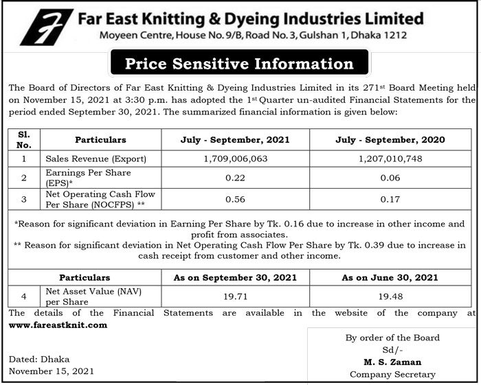 Price Sensitive Information of Far East Knitting & Dyeing Industries Limited