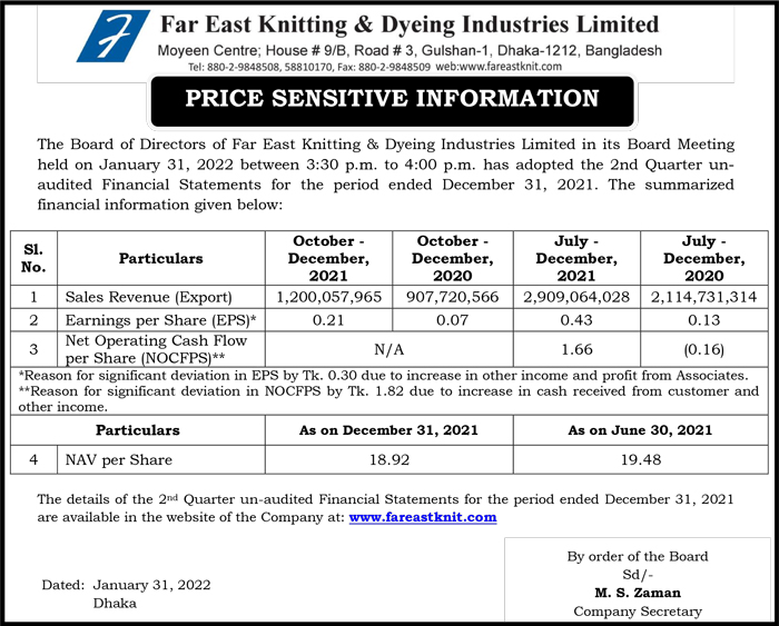 Price Sensitive Information of Far East Knitting & Dyeing Industries Limited