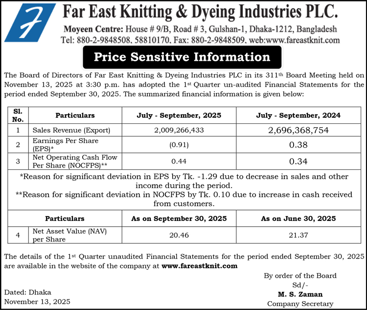 Price Sensitive Information of Far East Knitting & Dyeing Industries Limited