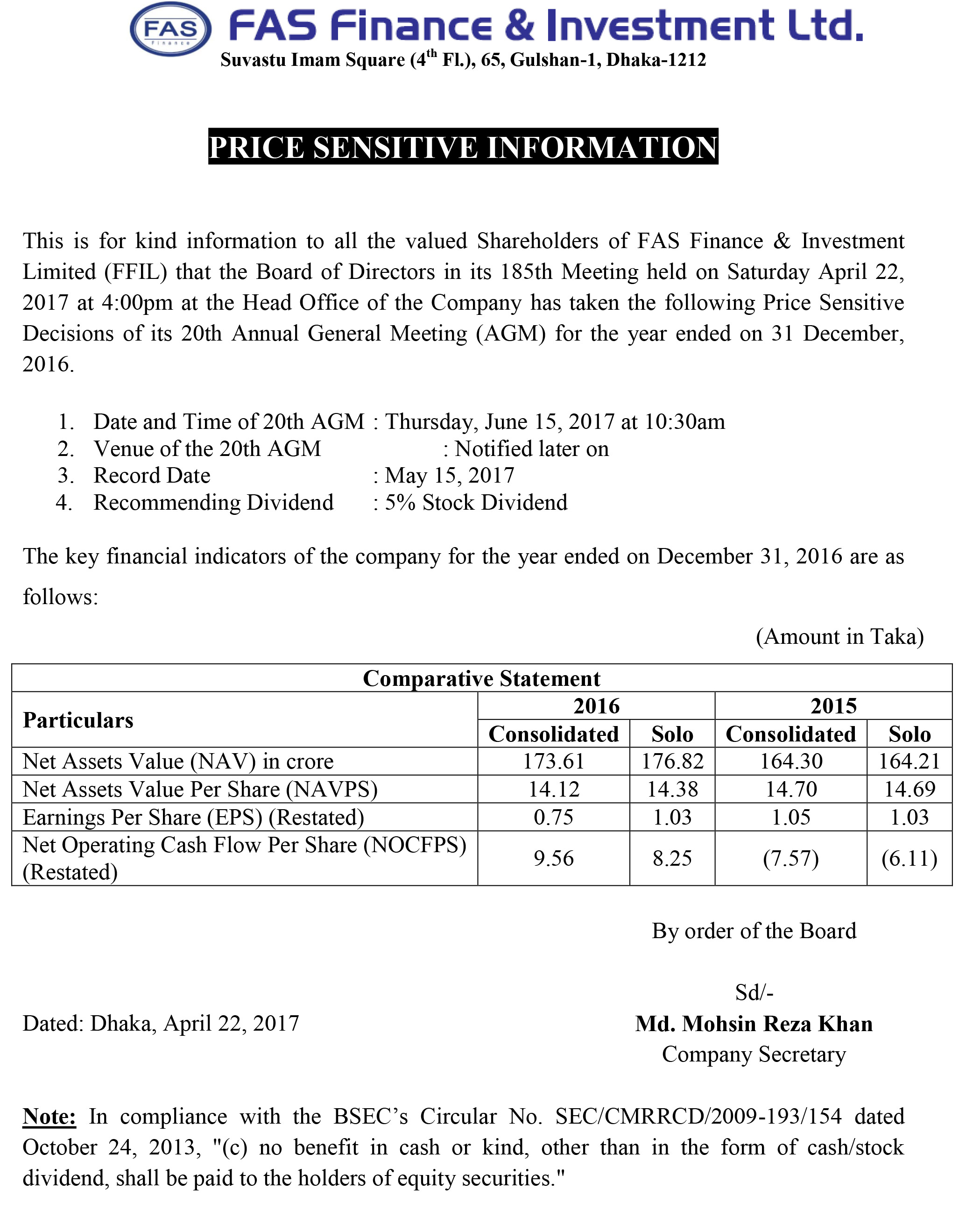 Notice of the 25th AGM of FAS Finance & Investment Limited