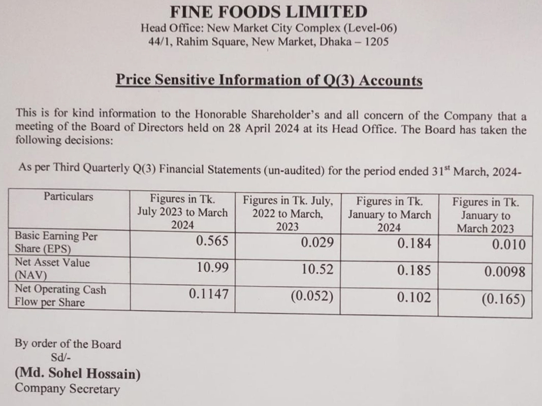 Price Sensitive Information (Q3) of Fine Foods Limited