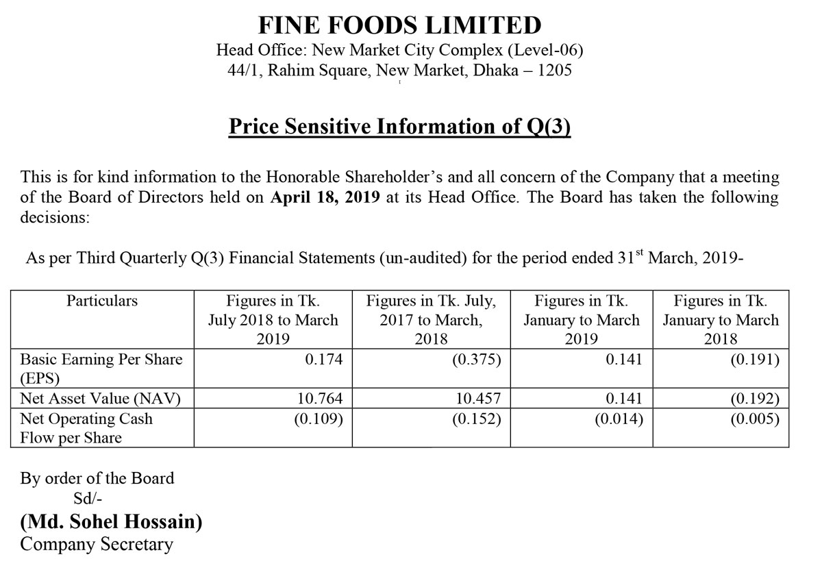 Price Sensitive Information (Q3) of Fine Foods Limited