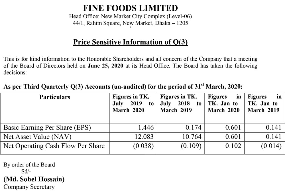 Price Sensitive Information (Q3) of Fine Foods Limited