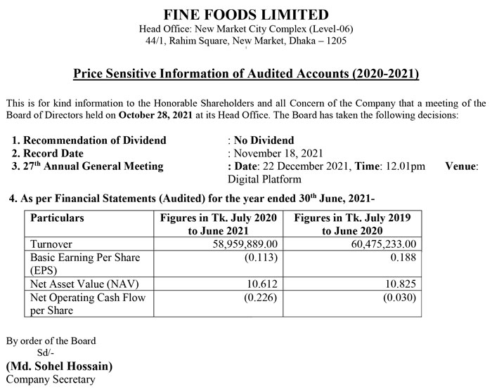 Price Sensitive Information (Audited Accounts) of Fine Foods Limited