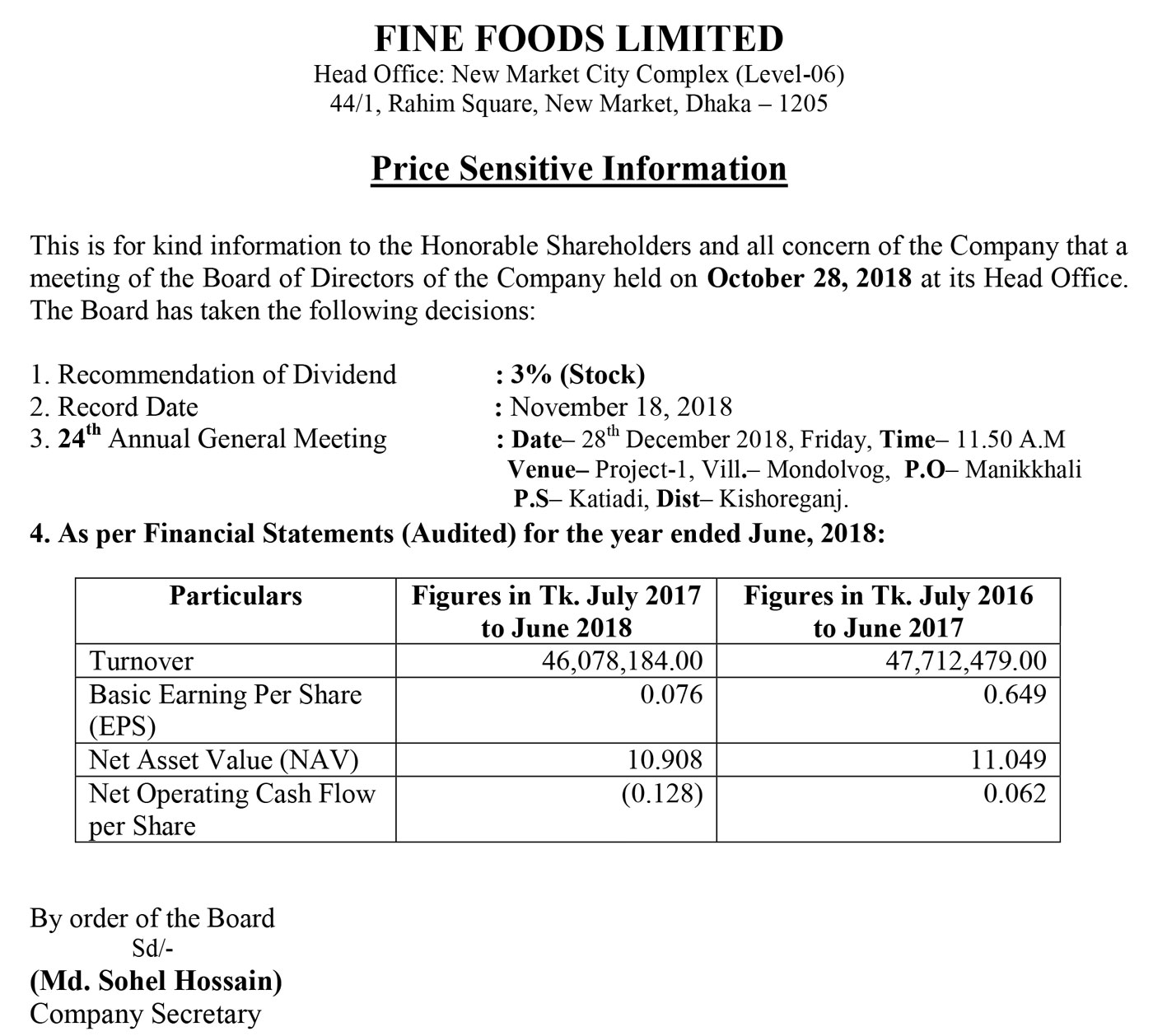 Price Sensitive Information (Audited Accounts) of Fine Foods Limited