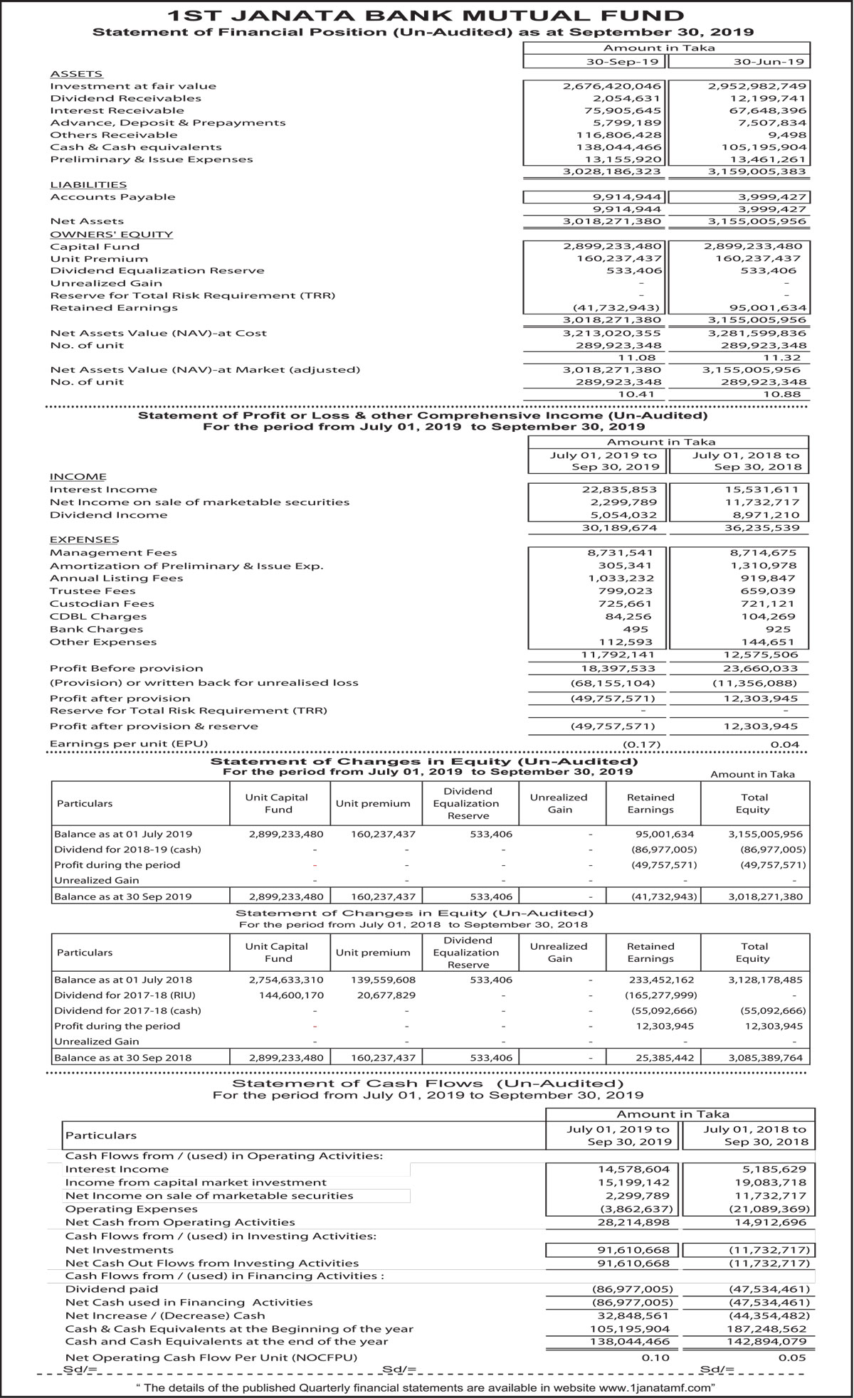 Statements of Financial Position (Un-audited) of First Janata Bank Mutual Fund