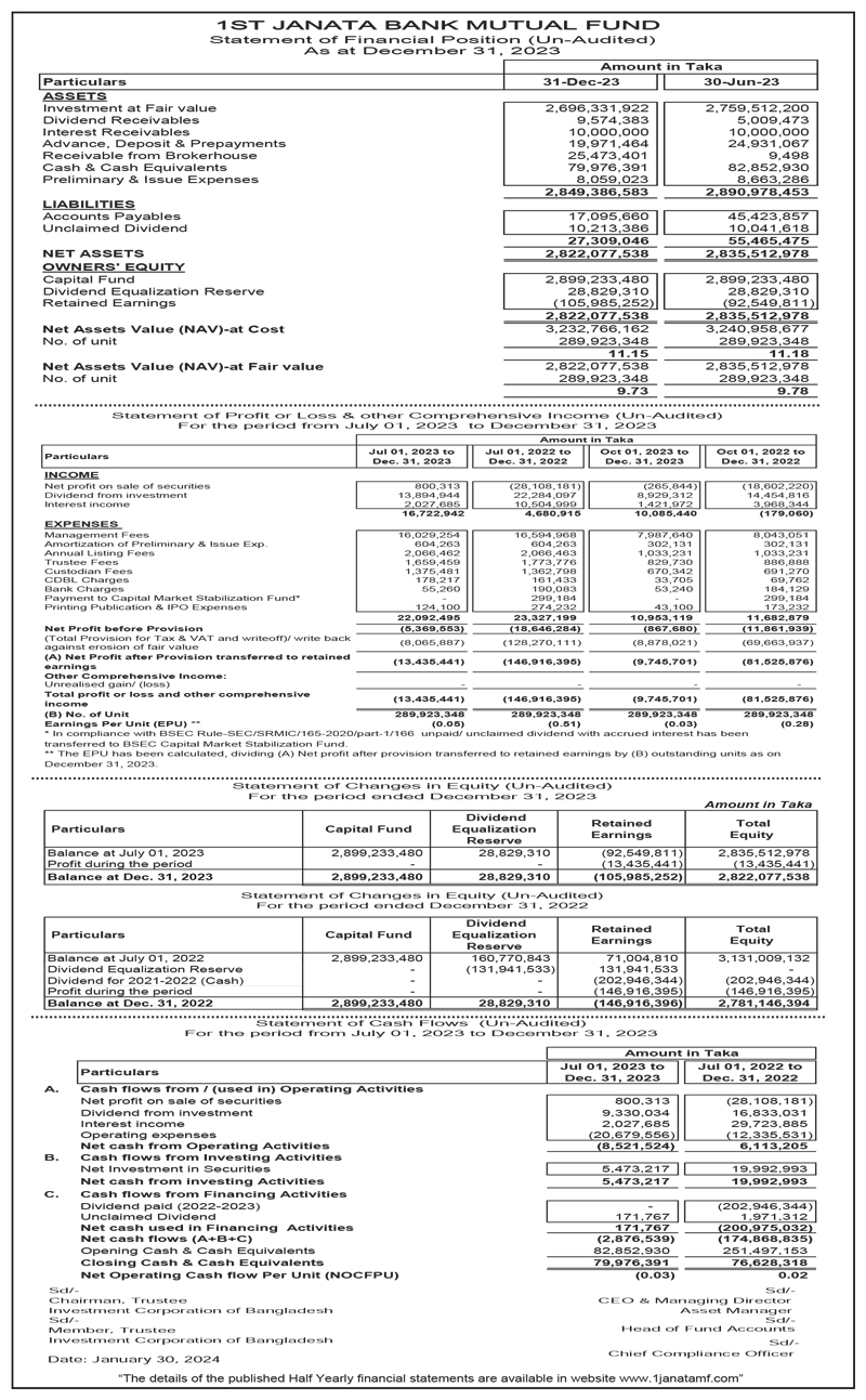 Statements of Financial Position (Un-audited) of First Janata Bank Mutual Fund