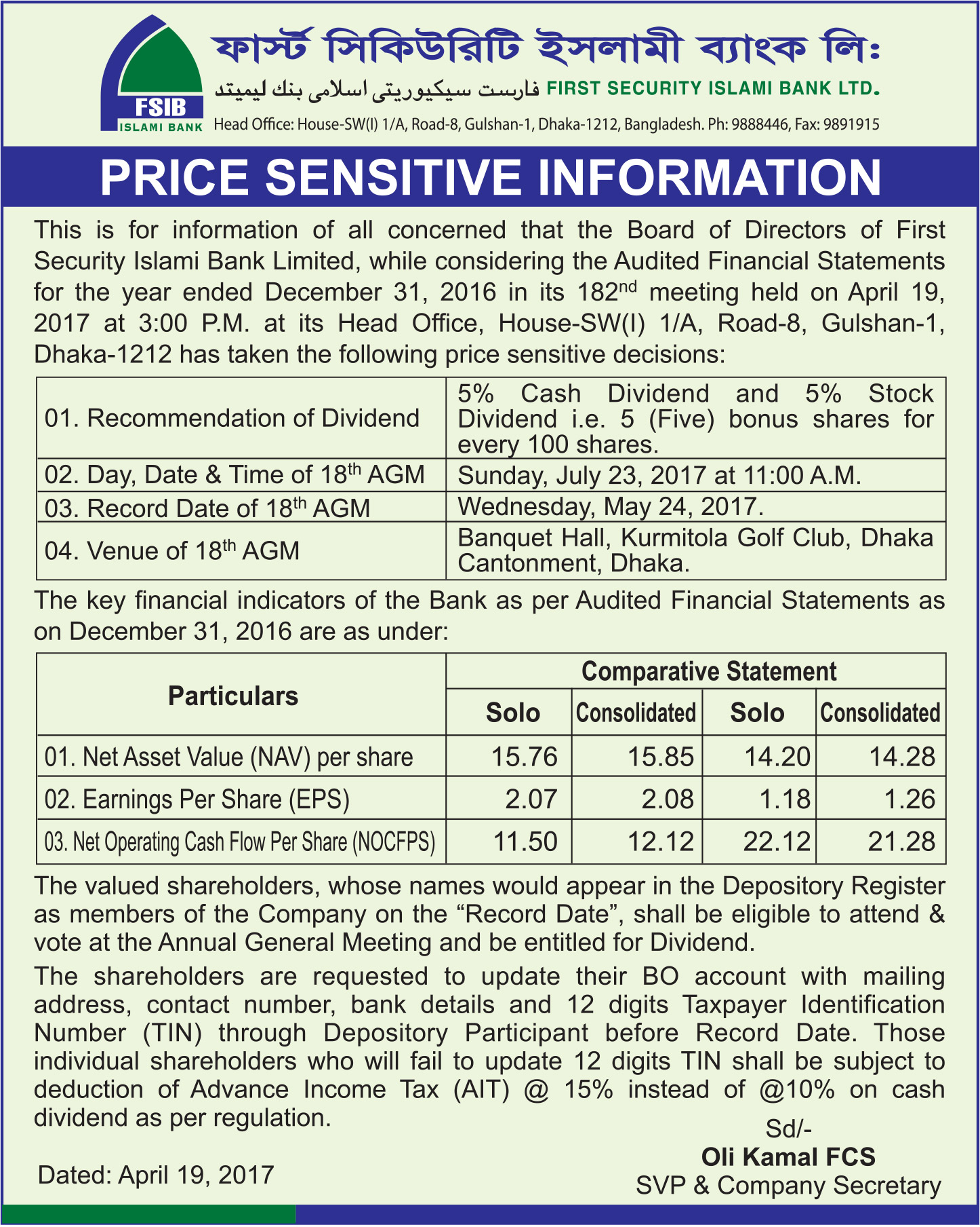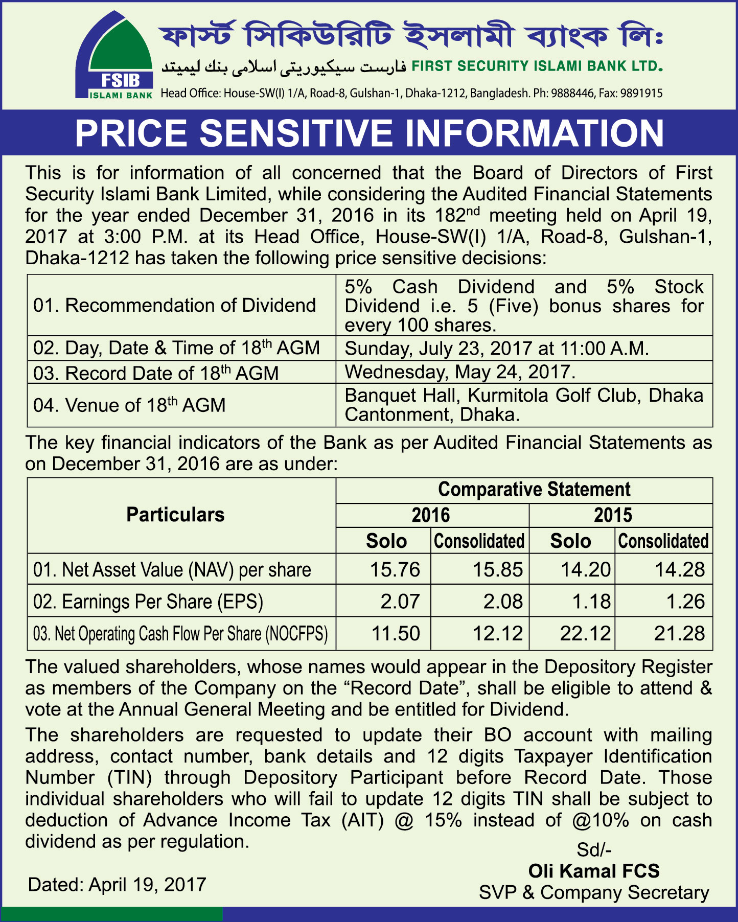 FIRST SECURITY ISLAMI BANK LIMITED CREDIT OF STOCK DIVIDEND: 2016