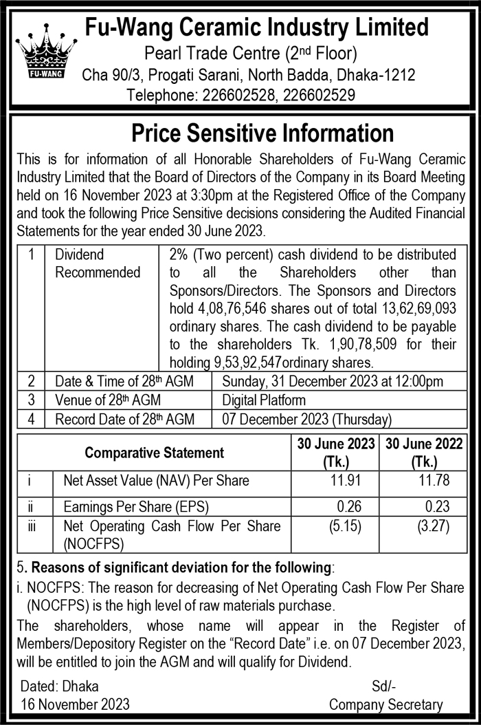 Price Sensitive Information of Fu Wang Ceramic Industry Limited