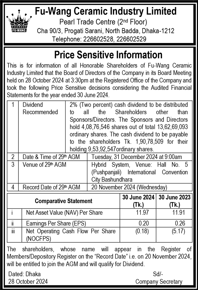 Price Sensitive Information of Fu Wang Ceramic Industry Limited