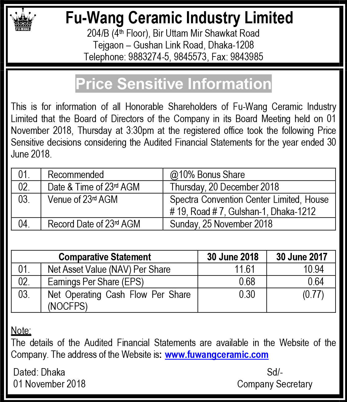 Price Sensitive Information of Fu Wang Ceramic Industry Limited