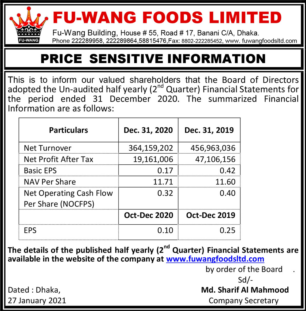 Price Sensitive Information of Fu-wang Foods Ltd.