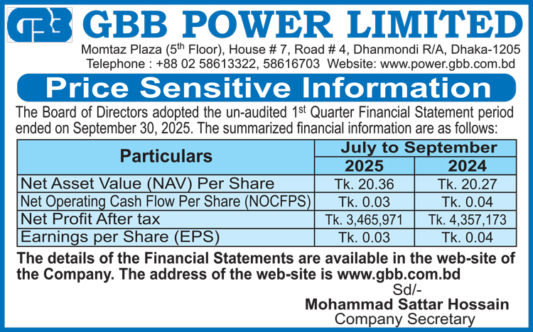Price Sensitive Information of GBB Power PLC.