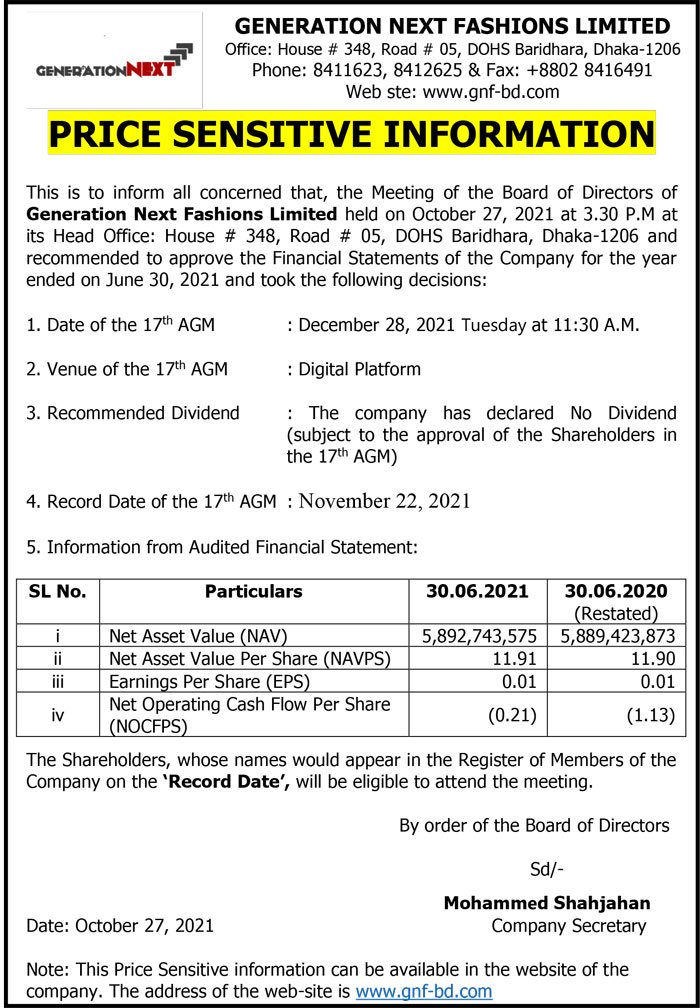 Price Sensitive Information of Generation Next Fashions Limited