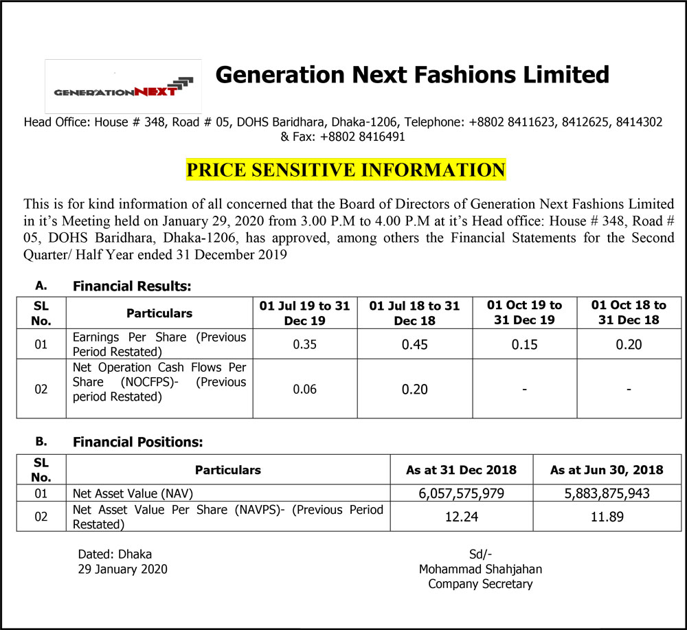 Price Sensitive Information of Generation Next Fashions Limited