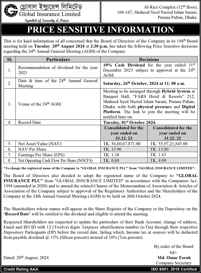 Price Sensitive Information of Global Insurance Ltd.