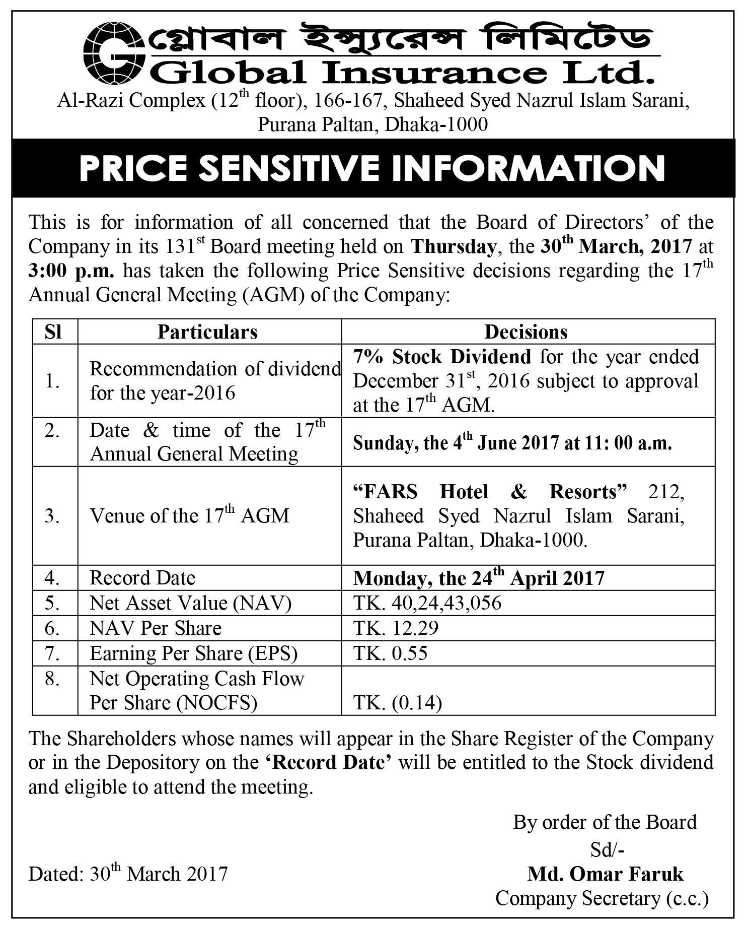 Noitce of the 21st Annual General Meeting of Global Insurance Ltd