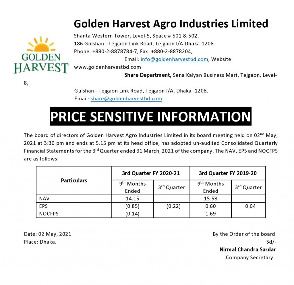 Price Sensitive Information of Golden Harvest Agro Industries Limited