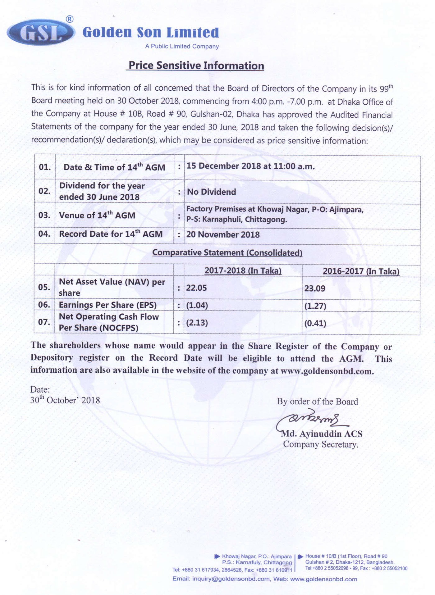 Price Sensitive Information of Golden Son Ltd.
