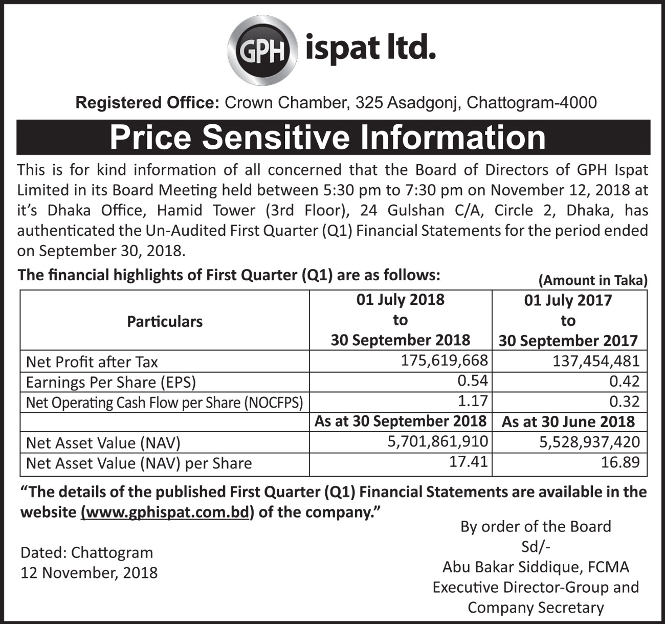 Price Sensitive Information of GPH Ispat Limited