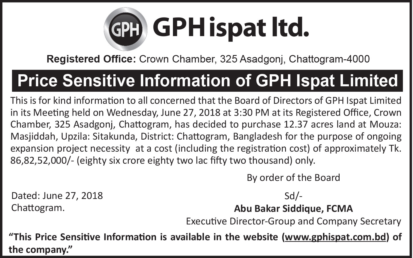 Price Sensitive Information of GPH Ispat Limited