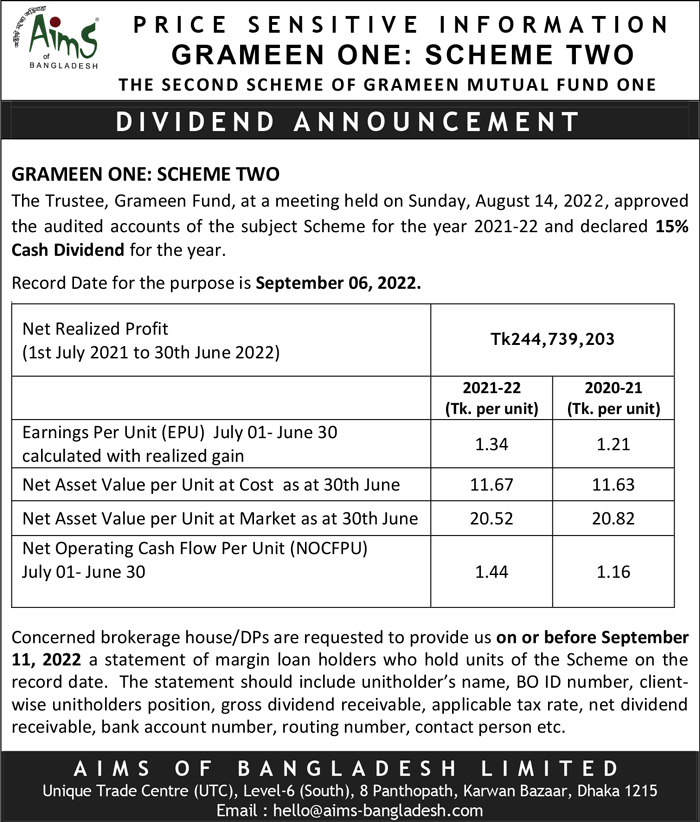 Price Sensitive Information of Dividend Announcement of Grameen One : Scheme Two
